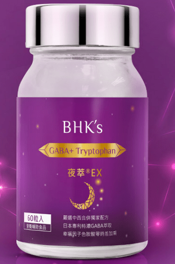 BHK’s-夜萃EX 素食膠囊添加GABA、色胺酸、酸棗仁萃取物、芝麻萃取物、維生素B6、B12等組成的助眠配方。但GABA並無標示劑量,也沒有標示出專利名稱。