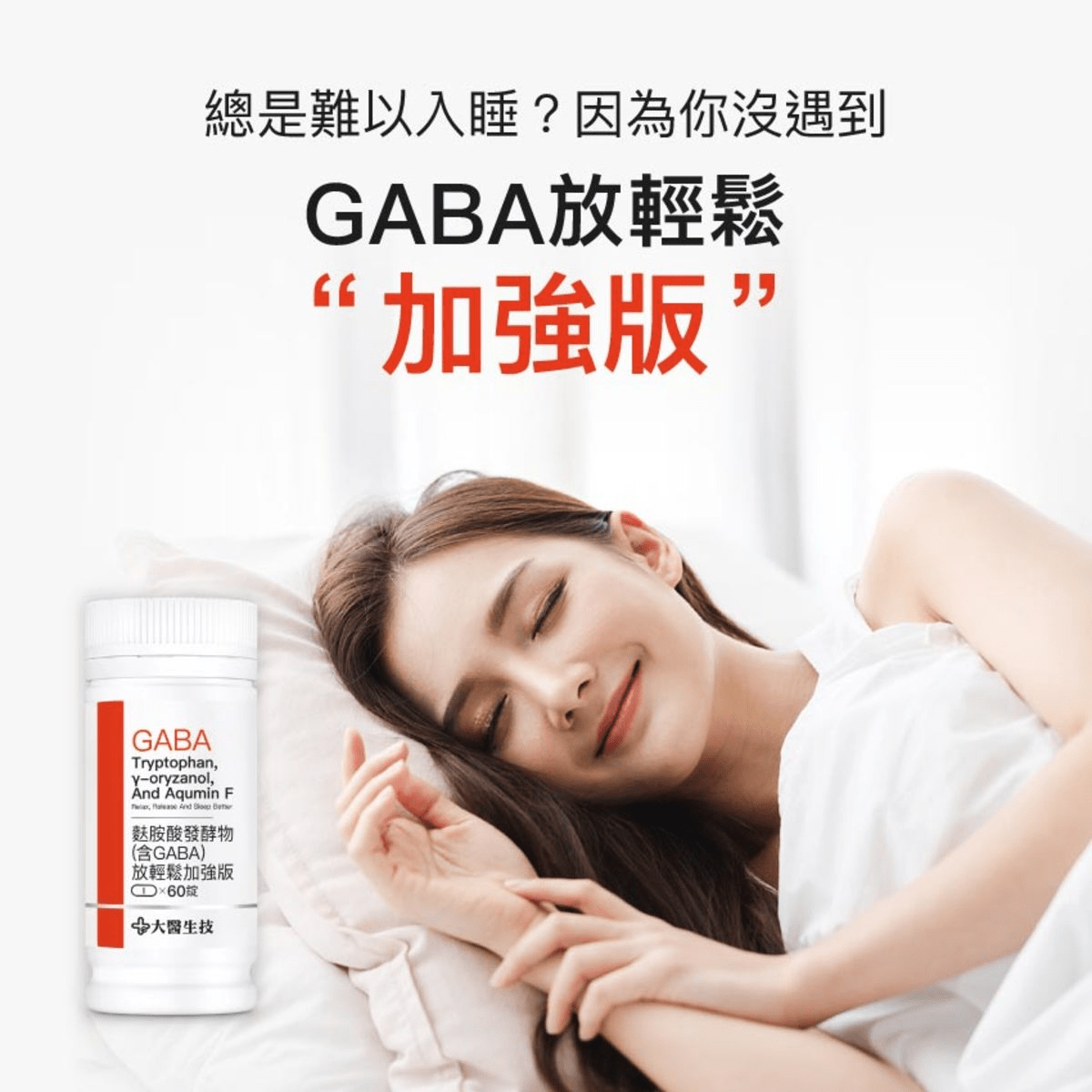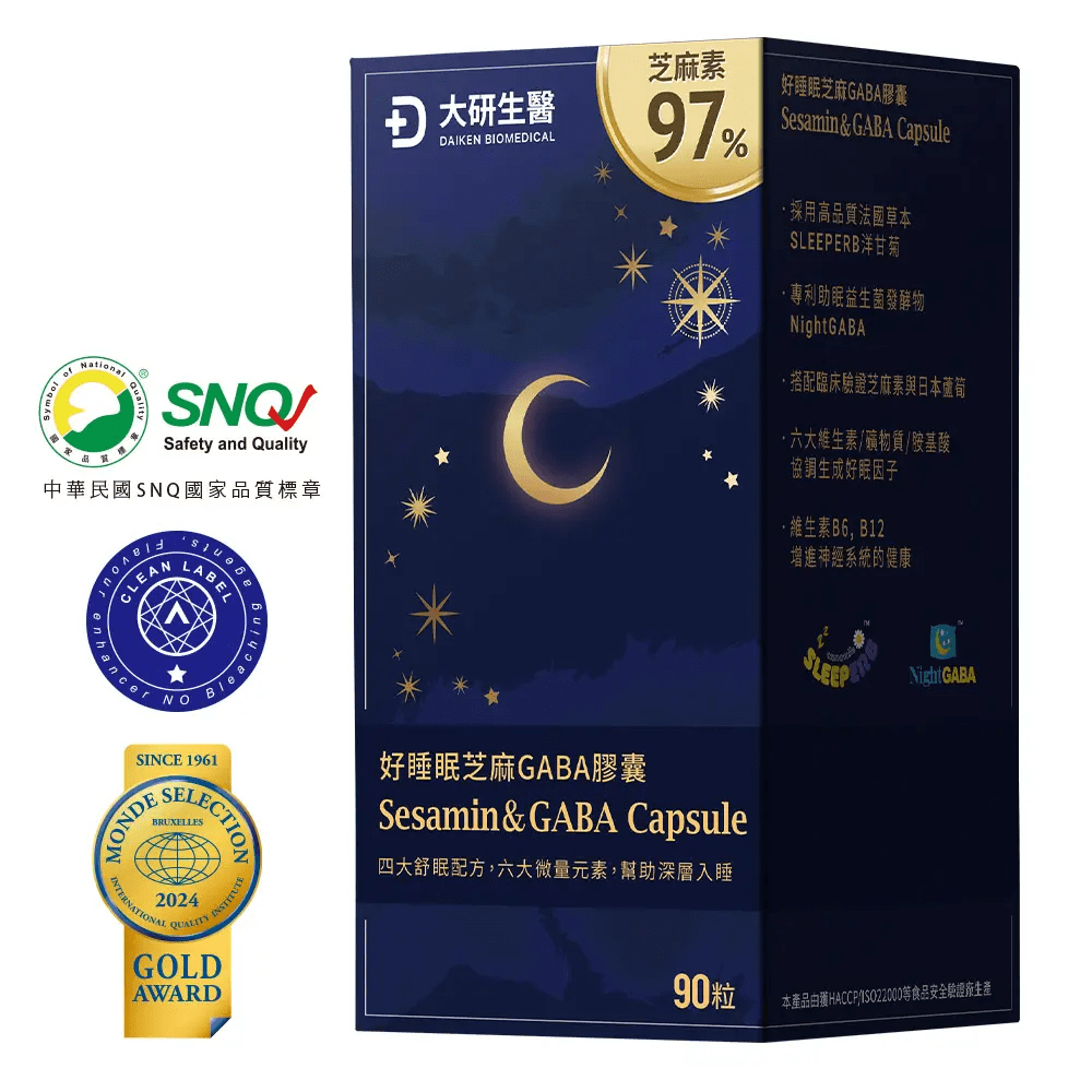 大研生醫-好睡眠芝麻素GABA膠囊選用專利NightGABA®的GABA原料,加上芝麻素、蘆筍萃取物、洋甘菊萃取物等組成助眠配方。配方完整,但化學添加物較多(例如阿拉伯膠、硬脂酸鎂、二氧化矽等)。