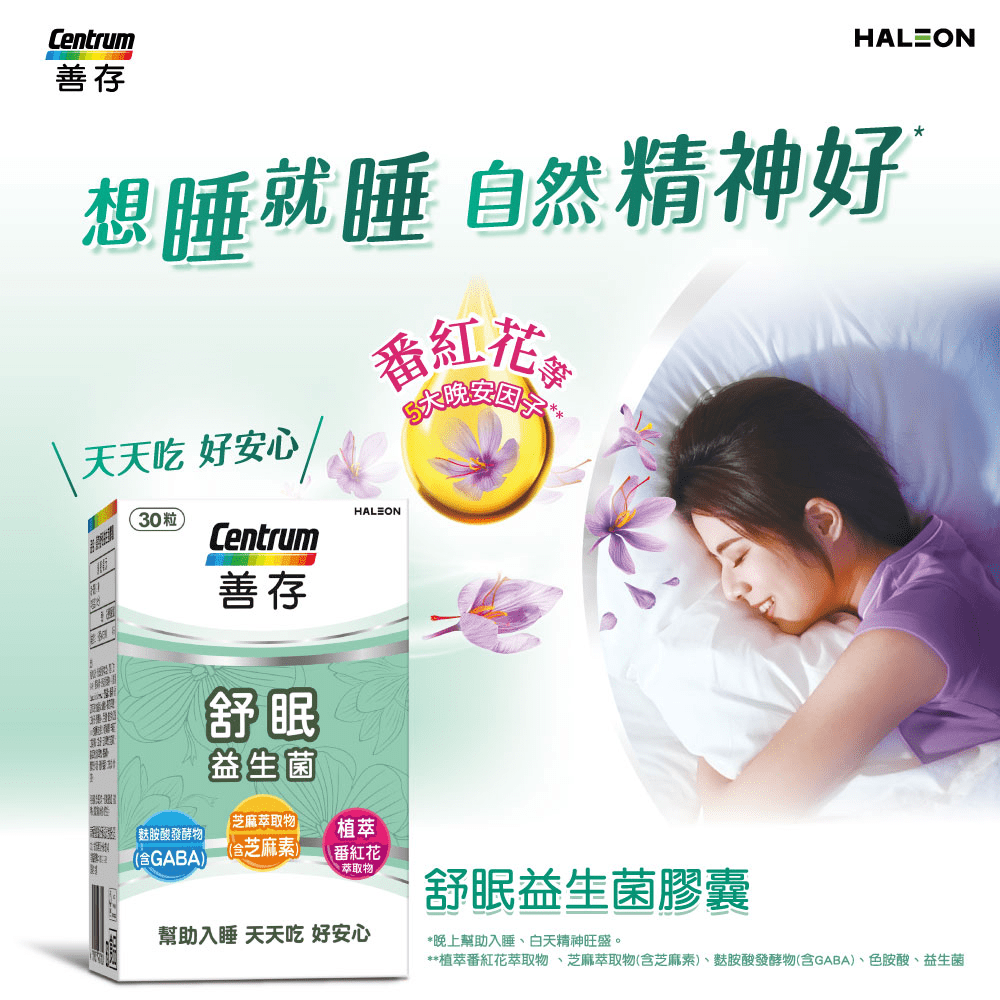 善存舒眠益生菌膠囊添加5大晚安因子(乳酸菌、番紅花、色胺酸、芝麻素及維生素E)幫助入睡,改善體質。網路及實體各大通路均有販售。